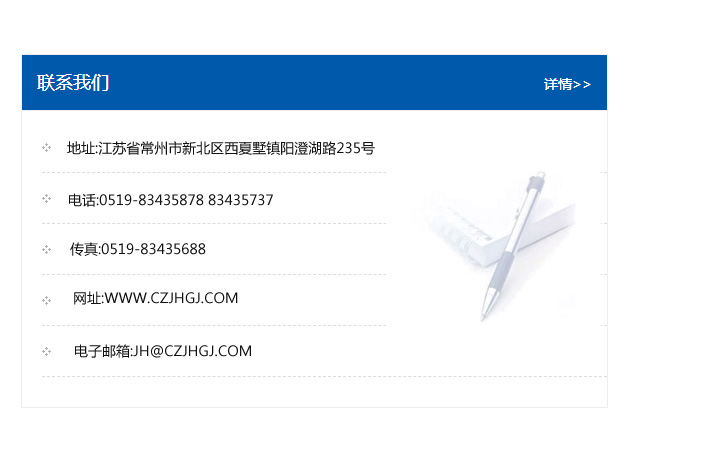 傳真:0519-83435688    郵編:213135    網址:WWW.czjhgj_com.blhcn.com    電子郵箱:JH@czjhgj_com.blhcn.com
